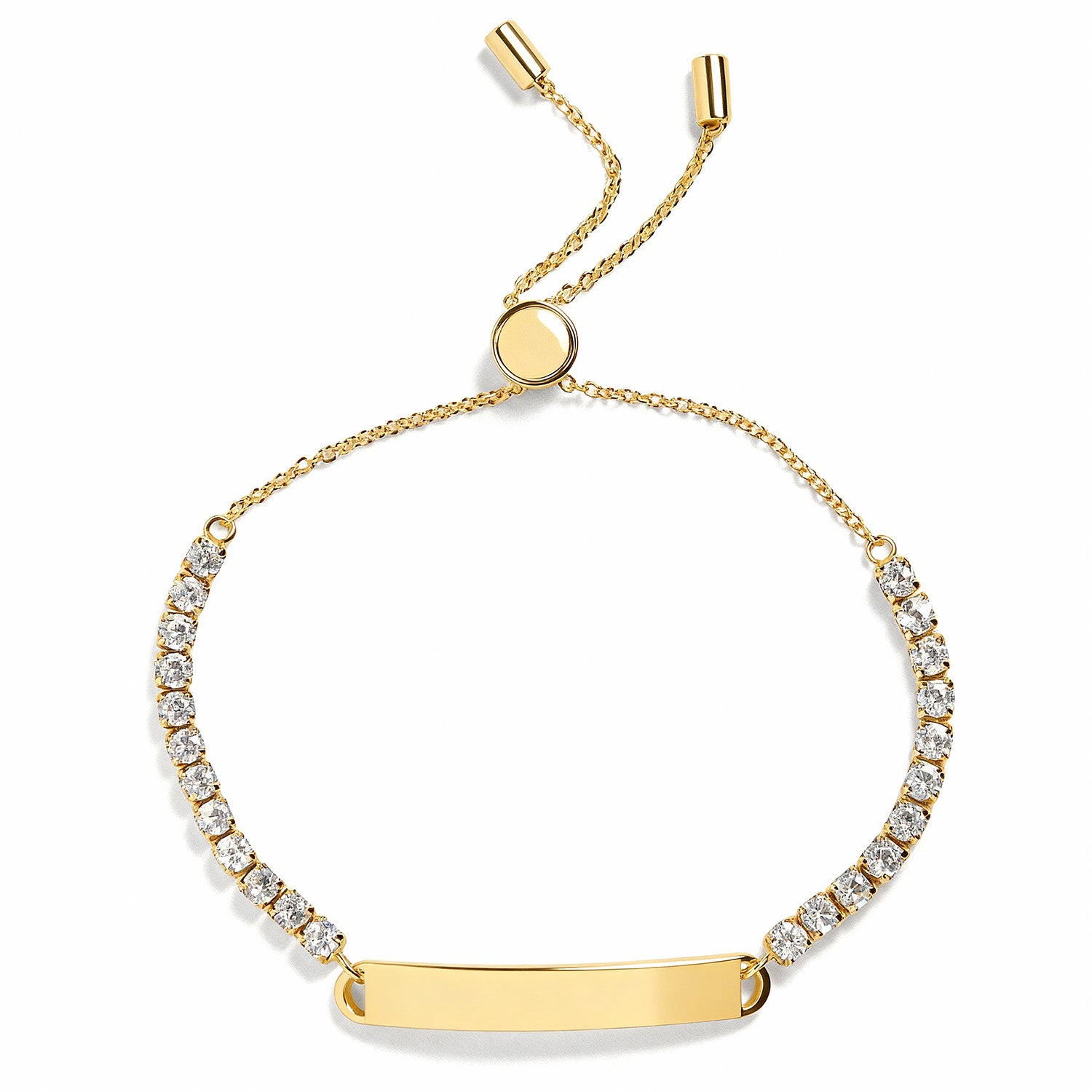 Personalize classic sparkle with our Engravable Bar Tennis Bracelet. This design features a sleek engravable bar at the center, framed by a row of shimmering CZ stones for timeless shine. The adjustable pull-tie closure ensures a perfect fit, making it as comfortable as it is elegant.